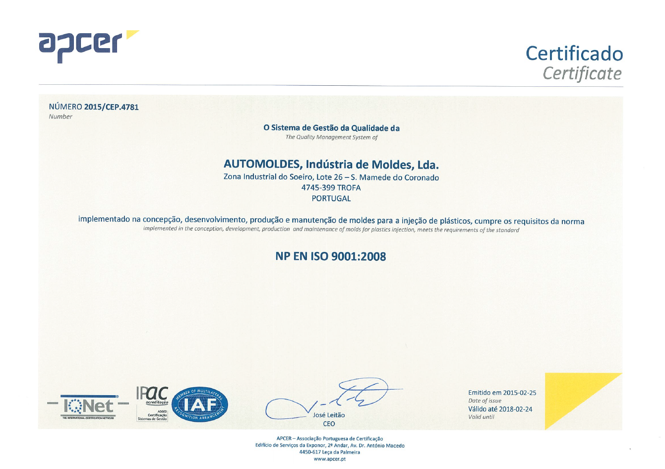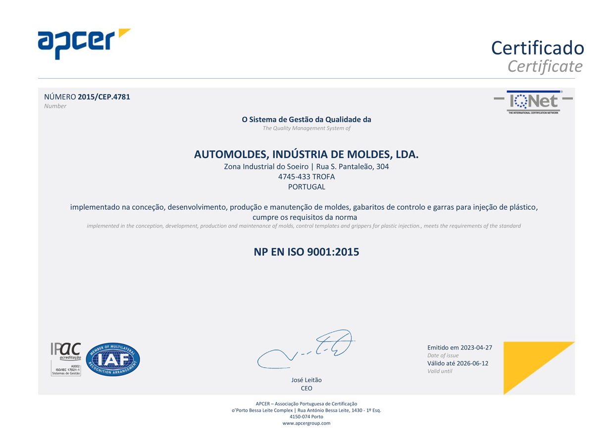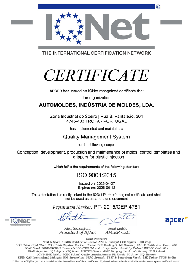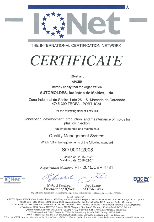 A AUTOMOLDES tem como princípio a garantia do cumprimento dos requisitos regulamentares e legais, dos clientes e das partes interessadas, trabalhando para a satisfação do cliente, propondo melhorias de produto, e melhorando continuamente a eficácia do sistema de gestão da qualidade.